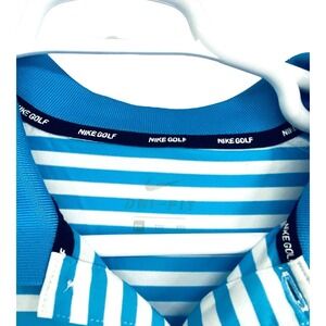 This Nike polo shirt is perfect for any sports enthusiast. The shirt is made of a blended fabric of polyester and spandex, making it lightweight and suitable for all seasons. It features a collared neckline with a spread collar style and short sleeves, perfect for a casual or activewear occasion. The shirt is designed with a blue striped pattern and Nike logo accents, giving it a sporty look.