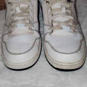 This is a pair of 2013 Nike Prestige White shoes with black swoosh and black soles. They are a size 11 and do show wear.