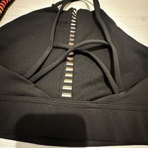 Includes black high-rise leggings and coordinating strappy sports bra with rainbow stripe detail.