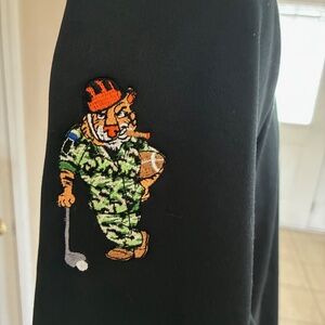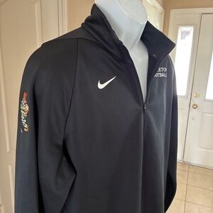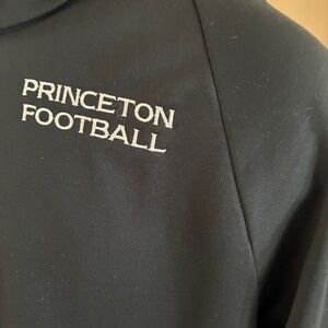This is a nice 1/4 zip pullover by Nike size L. It is made from 100% polyester and is black with "Princeton Football" on the chest in white. The sleeve has a cool tiger with a a football helmet, smoking a cigar, while holding a football and leaning on a golf club. The chest measures 48" and the length is 29-30". It is in excellent condition.