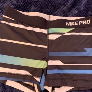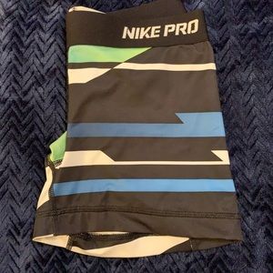 Nike Pro workout shorts! Awesome pattern and color! Barely worn! No rips , tears or piling! Super cute and eye catching pattern. The inside white tag is cut off because it was itchy. I cut off all those back togs. Great colors! They are a blocked pattern of Black, White, Royal Blue, and some neon green!