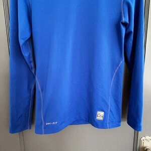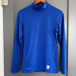 Nike Pro Combat Dri-Fit long-sleeve mock turtleneck shirt in men's size Medium (M). The shade is a cobalt blue. This base layer offers compression and is designed to meet the needs of championship athletes. It has an embroidered Nike logo on the neck.