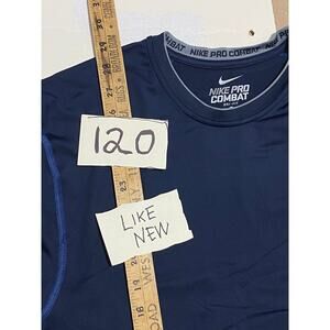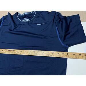Nike Pro Combat short sleeve fitted shirt in navy blue with small swoosh logo on chest. Lightweight Dri-FIT stretch fabric for performance and comfort. Tagged Large, flat lay measurements shown. Pre-owned, excellent condition with no major flaws. Great for gym drops, activewear bundles, or Nike resale.