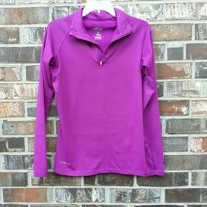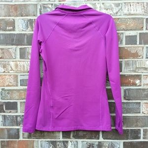 Excellent condition 1/4 zip plum/purple colored pullover, this is fleece lined and very warm. There is slight rubbing on the exposed stitch on back side.