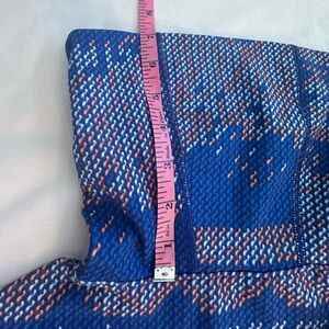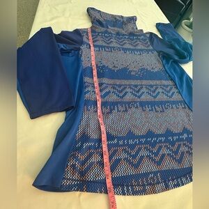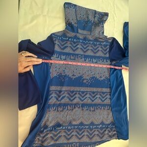 This Nike pullover is lightly worn and shows no obvious signs of wear that I can find except that there are no markings or tags anywhere on the inside. I am basing the size medium on me - I weigh 130 and I wear a size small & also the same pullover w/tags that is for sale on another site and shows the same approximate measurements. That listing also says that this is made of 88% polyester and 12% spandex. Has thumb holes and is machine washable - made in Sri Lanka. Great geometric pattern and colors!