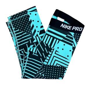 Elevate your workout wardrobe with these Nike Pro leggings! Crafted with DriFit technology, they promise comfort and style. The striking blue and black geometric print adds a touch of boldness. Sized perfectly at Medium, these cropped leggings feature a mid-calf length for a trendy look. Note: Light wear on knees, details captured in pictures.