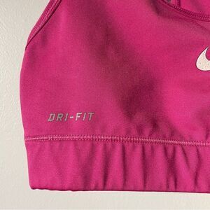 Stylish hot pink sports bra with Nike logo. Perfect for workouts. Elevate your workout wardrobe with the Nike Green Sports Bra, designed for optimal comfort and support. Featuring a moisture-wicking fabric and a racerback style, this bra ensures a secure fit during any activity. Its vibrant pink hue adds a pop of color to your activewear collection.
