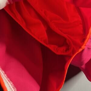 Dark pink with white mesh on the side of the running shorts. Lined and elastic waistband with drawstring.
