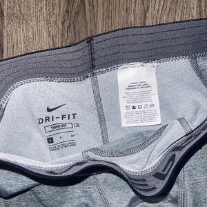 Sleek and sporty leggings. Features a bold black logo on a versatile gray fabric.