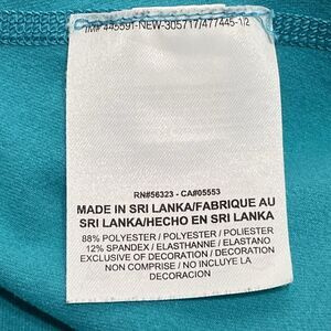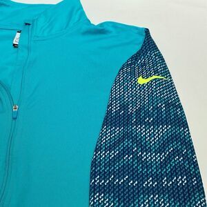 This is a lightly worn Women's Nike Pro Hyperwarm Thermal 1/2 Zip Pullover Top (649089-388) in a Size Large. This top is in very good condition with light general wear, no stains, and no picks or damage. The top is greenish blue with geometric Nordic patterned sleeves and neon yellow accents. The top is stretchy with a slick exterior and a soft fleece interior. The top has a slim, athletic fit with a curved bottom hem. I encourage you to enlarge the photos to view small details and to review the measurements on photo #11 to determine fit. If you have any questions about this item, please ask!