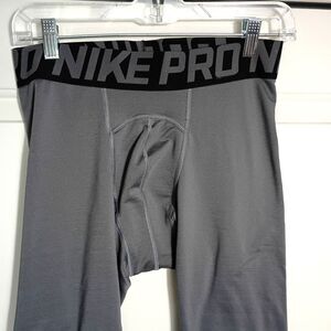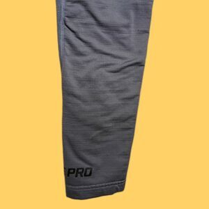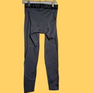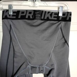 These Nike Pro Hyperwarm men's compression tights in size large are built for performance and cold-weather training. Designed in gray with black accents, they feature thermal fabric to keep muscles warm during intense workouts or football practice. They're in good condition with some visible wear to the fabric—no stains, tears, or damage. A solid, functional pair of tights ready for action on the field or in the gym.