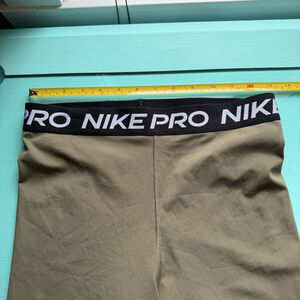 Nike Pro athletic shorts. Olive green with black waistband. Comfortable and stylish. Good condition. Some loose stitching as pictured. No size so please review measurements