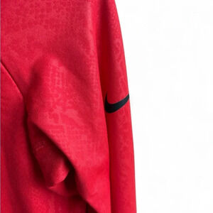 This Nike Pro Dri-Fit athletic pullover in women's size small features a vibrant red color and is designed for optimal performance. Crafted with moisture-wicking Dri-Fit technology, it keeps you cool and dry during intense workouts. The jacket includes a small zipper at the neck for adjustable ventilation and ease of wear. Its sleek, fitted silhouette offers comfort and flexibility, making it ideal for both training and casual wear.