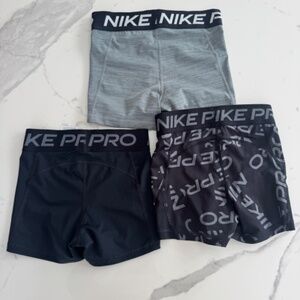 Set of three nike pro short, perfect for working out, volleyball, etc. Gray is size small, the others are size XS. See measurements for details. These are all lightly worn and have the usual signs of wear from this style.