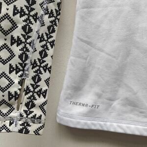Stay warm and move freely in this Nike Pro Therma-Fit long-sleeve top. White body with black geometric raglan sleeves for full range of motion. Soft, brushed interior helps retain heat; moisture-wicking stretch fabric keeps you dry. Slim, base-layer fit—ideal for running, training, or layering for cold-weather sports. Gently used with light wear (see photo of small discoloration on the front).
