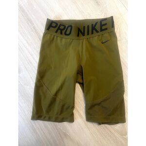 Nike Pro shorts, olive green compression shorts, workout gear, running shorts, yoga shorts, Dri-FIT technology, XS training shorts, Nike activewear