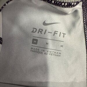 These Nike Pro Dri-Fit tights are designed with a striking purple and black pattern. Crafted for performance, the fabric blend ensures optimal stretch, breathability, and moisture-wicking for strenuous workouts. The snug fit enhances mobility while maintaining comfort. Ideal for running or gym sessions, the Nike Pro waistband offers secure support.