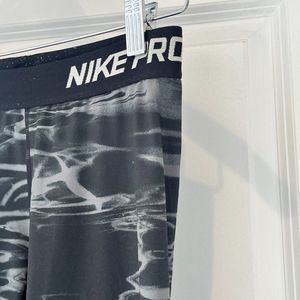 Nike Pro cropped leggings, black and gray pattern, Size Medium. GUC, some wear on swoosh and on waistband. Otherwise material is good condition. Length is 18".