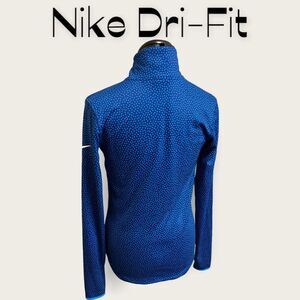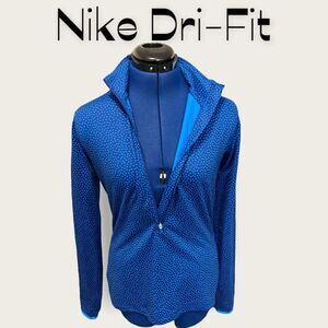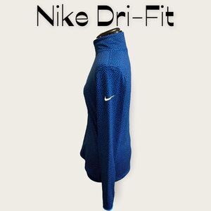 This is a listing for a Nike Pro Warm Dri-Fit Long Sleeve Half Zip Pullover Top ✿ Size: Women’s Medium ✿ Dark blue with bright Polka Dot Print ✿ This is in excellent pre-owned condition with some very minor signs of wear. There may be a little bit of cracking at end of swoosh logo ✿ Perfect top to keep warm during outdoor winter workouts - soft cozy fleece lining and thumb holes.
