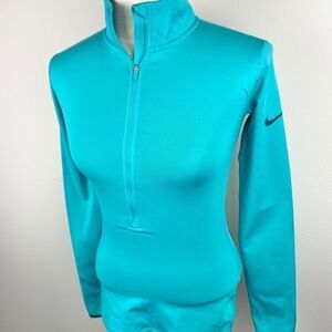 This pullover is in excellent condition. Featured with a 1/2 zip up the front and thumb holes on the sleeves. Teal in color and size small. Made from polyester and spandex. Please send any offers or questions!