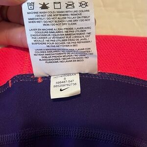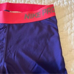 Excellent condition Nike Pros in purple with a hot pink waistband. Size small. Inseam was a little hard to measure due to the crotch construction, but about 6.5”