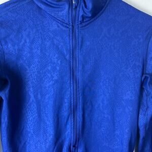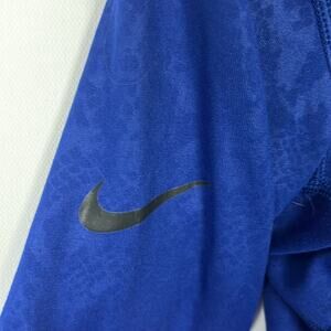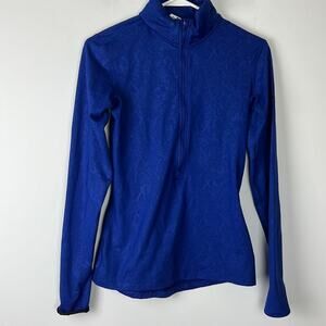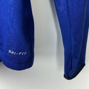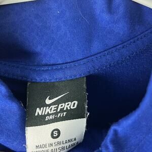 Gently Used Nike Pro Dri-Fit Half Zip Pullover. This is a women's small. Nice shade of blue with a subtle pattern throughout. Dri-Fit text along the waist. Black Nike swoosh on the left shoulder. Perfect for the gym or on the go!