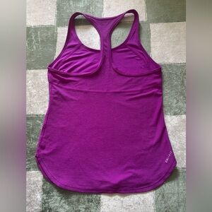 Vibrant purple tank top with orange Nike logo. Dri-FIT technology for comfort.
