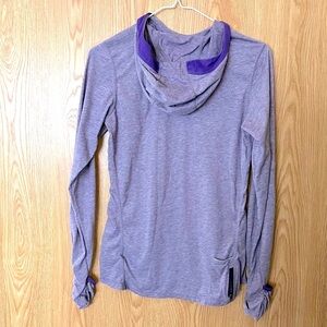 This top is a beautiful shade of purple, lightweight and breathable, with a hoodie and extra scrunch detailing cuffs and tiny pockets.