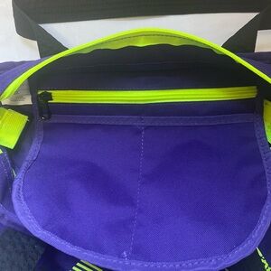 Vibrant purple Nike tote with striking yellow design. Durable black handles.