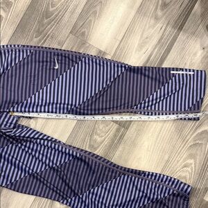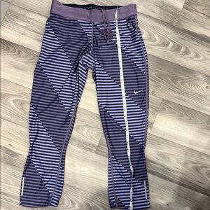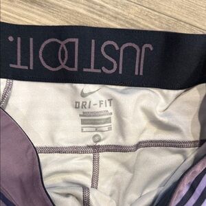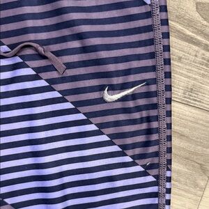 Comfortable Nike leggings with purple and black design. Ideal for active wear.