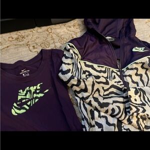 Nike activewear set with a purple t-shirt, matching pants, and zebra print jacket. Ideal for sporty style.
