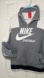 Nike quarter zip pullover sweater with bold logo. Features gray and white color scheme. Comfortable and stylish.