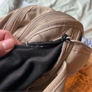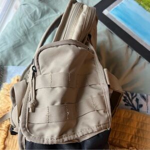 Modern Nike backpack with a beige and black design. Ideal for daily use. Features a stylish look.