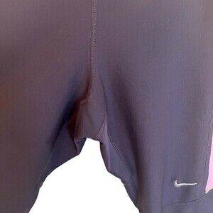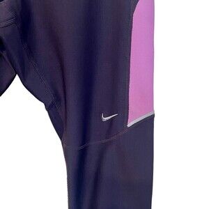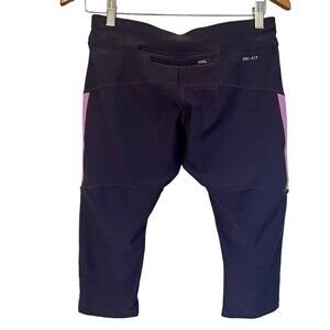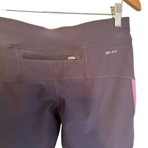 Nike running dri-fit cropped leggings, gray with light purple coloring in several areas. Cropped. Back center zipper pocket. Elastic drawstring waistband. Stretches beyond it's marked size. Compression for added comfort while running. NWOT, new condition.