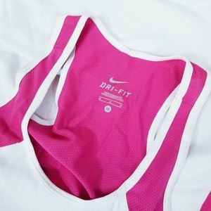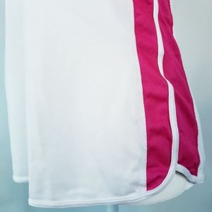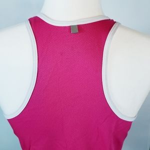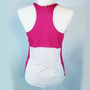 Pink and white racerback tank has a jersey fabric and reflective logo and tag in the back. Good condition.