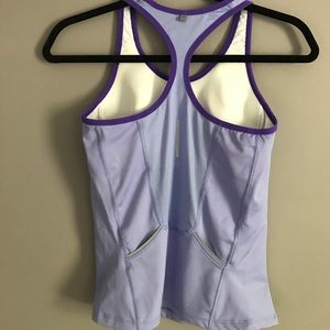 Purple workout tank top with built in bra and two tiny pockets in the back