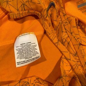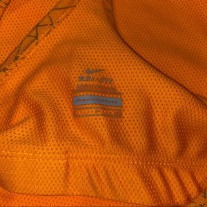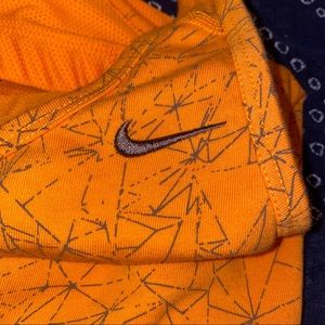 Super cute Racerback tank from Nike with a fun orange with grey geometric pattern. Has a built in bra and mesh down the center of the back. Perfect for a summer workout!