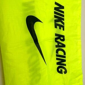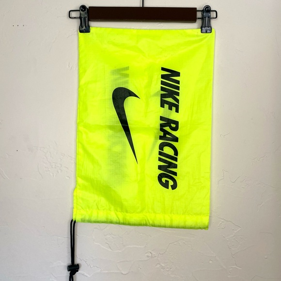 Vibrant neon yellow drawstring bag with Nike Racing logo. Ideal for sports and travel. Gentle used condition.