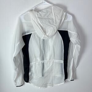 Gently Used Nike Full Zip Lightweight Rain Jacket. This is a women's small. Mostly white with black accents on the sides. Reflective Nike swoosh on the front. Front zipper pockets. Reflective dots on the back and sleeves. This would be great for running or outdoor activities! Easily packable. 100% nylon.