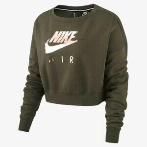 Nike Air Women’s Rally Crew Sweatshirt. Medium. Olive green color with rose gold tone graphic and back zipper. Cropped fit. Back zipper is fully functional. Soft interior. Perfect for workout or pair with jeans!