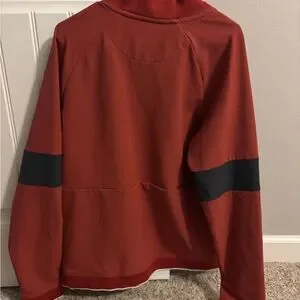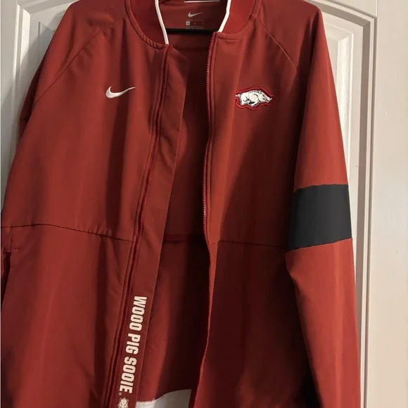 Razorback red jacket with white details. Features Nike logo on chest. Perfect for athletic wear.