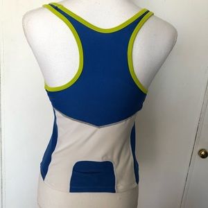 White, Blue with Lime Green Trim. Shelf bra. Small pick at bottom. See pic. Shoulder to Hem -20”. Small pocket in back.