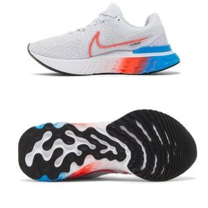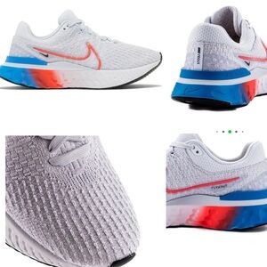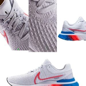White Nike sneakers with red swoosh. Blue and gray accents. Flyknit material for comfort.worn once like new