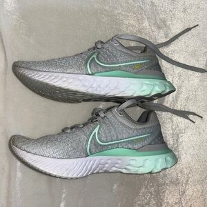 Women's Nike React Infinity Flyknit running shoes in Pure Platinum /Mint Foam / White. Size 9. I walked in these maybe 7 times. Still in great condition but I have too many pairs of sneakers plus these seem to fit just a little bit smaller than my other Nikes. In original box. Non smoking no pet home. Some mild darkening at the toes and tinted sunscreen rubbed off at inside tongues.
