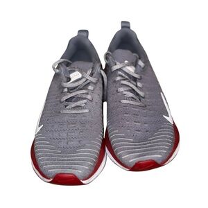 Sleek Nike shoes with a modern design. Gray upper with red accents. Ideal for sports and casual outings.