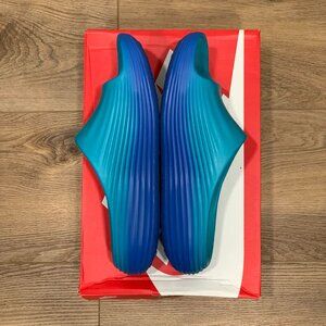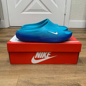 VERY LIGHTLY USED (worn 1-2x). One of Nike's most comfortable slides, the ReactX Rejuven8 Slide is your next go-to slide option. It features a gradient blue upper and plush materials for a soft feel with a grippy outsole. Size 10M | SKU: HV4479-300 | Includes original box (with minor damage/dents)