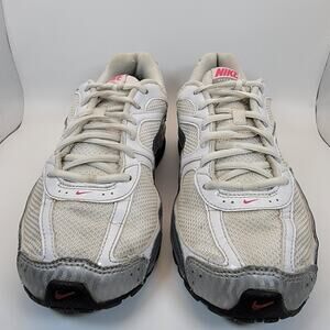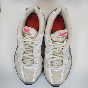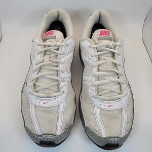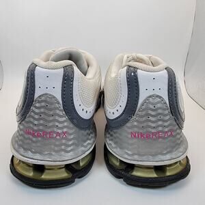 Nike Reax Run 5 women’s running shoes in size 8.5 (US). These sneakers feature a white mesh and leather upper with gray and pink accents and the signature Reax cushioning system. Lightweight, breathable, and built for comfort!