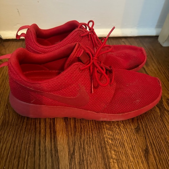Really cool pair of Nike solid red sneakers. Bought from Poshmark and wore twice. One small imperfection in the inside toe area of the left shoe, pictured in 3rd pic.