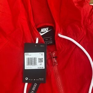 Vibrant red Nike pullover with hood. Features logo on front and sleeve accents.