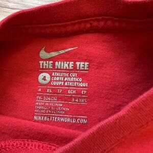Size 4, Nike, long sleeve red graphic tee. Small hole and spot, see close up photos.